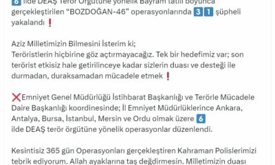 Bakan Yerlikaya: 6 ilde DEAŞ terör örgütüne yönelik bayram tatili boyunca gerçekleştirilen Bozdoğan-46 operasyonlarında 31 şüpheli yakalandı.
