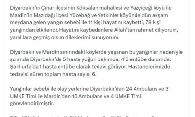 Sağlık Bakanı Fahrettin Koca: Diyarbakır’ın Çınar ilçesinin Köksalan mahallesi ve Yazçiçeği köyü ile Mardin’in Mazıdağı ilçesi Yücebağ ve Yetkinler köyünde dün akşam meydana gelen yangın sebebi...