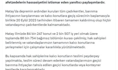 DMMnin sosyal medya hesabından yapılan açıklamada, “Çeşitli sosyal medya hesaplarında Hatayda hala çadırda kalan depremzedeler var şeklinde paylaşılan içerikler, gerçeği yansıtmayan, kamuoyunda yanlış algı oluşturmayı amaçlayan...