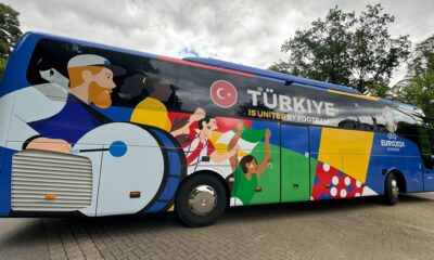 EURO2024 logosu ve Türkiye yazısı ile bayrağı otobüsü süslerken davul çalan taraftar figürü dikkat çekti. Turnuva boyunca Barsinghausen kenti yakınlarındaki Sporthotel Fuchsbachtalda konaklayacak Ay-yıldızlılar için tesislerde...