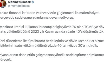 Bakan Şimşek, sosyal medya hesabından yaptığı açıklamada, “Makro finansal istikrarın ve rezervlerin güçlenmesi ile makroihtiyati çerçevede sadeleşme adımlarına devam ediyoruz. Reeskont kredisi kullanan ihracatçılar için yüzde...