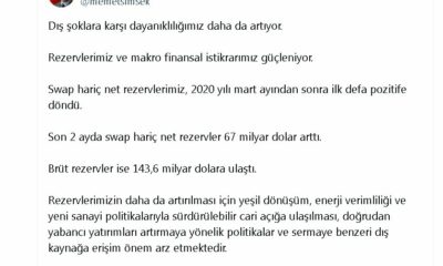 Bakan Şimşek, Türkiye Cumhuriyet Merkez Bankası rezervlerine ilişkin sosyal medya hesabından yaptığı açıklamada, “Dış şoklara karşı dayanıklılığımız daha da artıyor. Rezervlerimiz ve makro finansal istikrarımız güçleniyor....