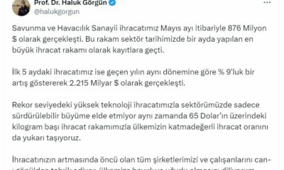 Savunma Sanayii Başkanı Görgün, sosyal medya hesabından yaptığı açıklamada, “Savunma ve havacılık sanayii ihracatımız mayıs ayı itibariyle 876 milyon dolar olarak gerçekleşti. Bu rakam sektör tarihimizde...