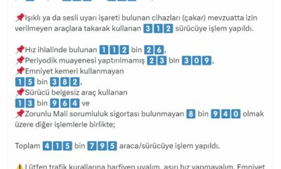 Bakan Yerlikaya, sosyal medya hesabından yaptığı açıklamada, “Emniyet ve jandarma trafik ekiplerimizce 23-30 Mayıs 2024 tarihleri arasında 2 milyon 464 bin 169 araç denetlendi. Işıklı ya...