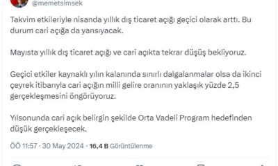 Bakan Şimşek, sosyal medya hesabından yaptığı açıklamada, “Takvim etkileriyle nisanda yıllık dış ticaret açığı geçici olarak arttı. Bu durum cari açığa da yansıyacak. Mayısta yıllık dış...