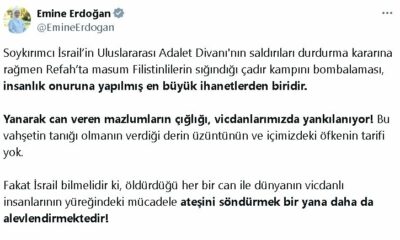 Emine Erdoğan, sosyal medya hesabından yaptığı açıklamada, “Soykırımcı İsrailin Uluslararası Adalet Divanının saldırıları durdurma kararına rağmen Refahta masum Filistinlilerin sığındığı çadır kampını bombalaması, insanlık onuruna yapılmış...