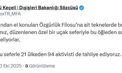 Dışişleri Sözcüsü Keçeli, sosyal medya hesabından yaptığı açıklamada, “İsrail tarafından el konulan Özgürlük Filosuna ait teknelerde bulunan 18 vatandaşımız, düzenlenen özel bir uçak seferiyle bu öğleden...