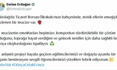Emine Erdoğan, sosyal medya hesabından, Tekirdağda okullarında yaptıkları kompost gübreyle çilek yetiştiren öğrencilerin videosunu paylaşarak, “Tekirdağda Ticaret Borsası İlkokulu’nun bahçesinde, minik ellerin emeğiyle filizlenen bir mucize...