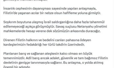 TBMM Başkanı Numan Kurtulmuş, Gazzede sağlanan ateşkese ilişkin sosyal medya hesabından açıklama yaptı. Kurtulmuş, “Gazze’nin kurtuluşu, filoların, sivil toplumun, uluslararası kamuoyunun ve başta ülkemiz olmak üzere...