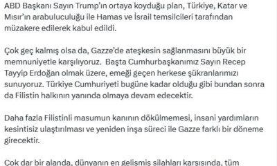 Cumhurbaşkanı Yardımcısı Cevdet Yılmaz, Gazzede sağlanan ateşkese ilişkin sosyal medya hesabından açıklama yaptı. Yılmaz, “ABD Başkanı Sayın Trumpın ortaya koyduğu plan, Türkiye, Katar ve Mısırın ara...