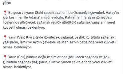 Bakanlığın sosyal medya hesabından yapılan açıklamada, “Meteoroloji Genel Müdürlüğünden alınan son bilgilere göre; bu gece ve yarın (Salı) sabah saatlerinde Osmaniye çevreleri, Hatayın kıyı kesimleri ile...