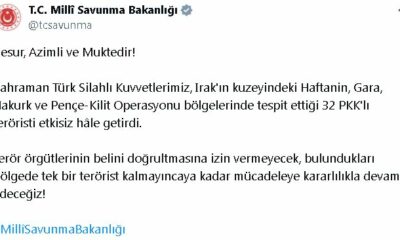 Bakanlığın sosyal medya hesabından yapılan açıklamada, “Cesur, azimli ve muktedir. Kahraman Türk Silahlı Kuvvetlerimiz, Irakın kuzeyindeki Haftanin, Gara, Hakurk ve Pençe-Kilit Operasyonu bölgelerinde tespit ettiği 32...