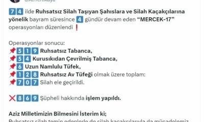 İÇİŞLERİ Bakanı Ali Yerlikaya, son 4 günde 74 ilde ruhsatsız silah taşıyan kişilere ve silah kaçakçılarına yönelik düzenlenen Mercek-17 operasyonlarında 707 silah ele geçirildiğini ve 869...