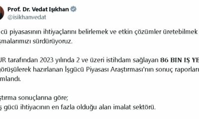 ÇALIŞMA ve Sosyal Güvenlik Bakanı Vedat Işıkhan, Türkiye İş Kurumunun (İŞKUR) İşgücü Piyasası Araştırması sonuçlarına göre; iş gücü ihtiyacının en fazla olduğu alanın imalat sektörü olduğunu...