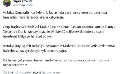 CUMHURİYET Halk Partisi Genel Başkanı Özgür Özel, Antalyada 1 kişinin hayatını kaybettiği, 7 kişinin de yaralandığı teleferik kazasına ilişkin 10 kişilik ekibin incelemelerde bulunmak üzere bölgeye...