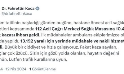 SAĞLIK Bakanı Fahrettin Koca, bayram tatilinin başladığı günden bugüne kadar 112 Acil Çağrı Merkezi Sağlık Masasına 10 bin 456 trafik kazası ihbarı geldiğini belirterek, “Kaza sayıları,...