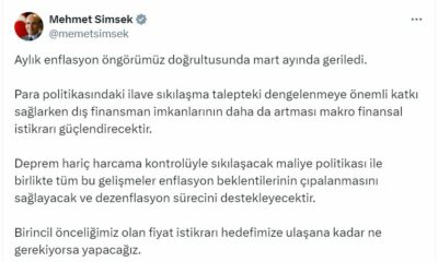 HAZİNE ve Maliye Bakanı Mehmet Şimşek, “Aylık enflasyon, öngörümüz doğrultusunda mart ayında geriledi. Birincil önceliğimiz olan fiyat istikrarı hedefimize ulaşana kadar ne gerekiyorsa yapacağız” dedi.Hazine ve...