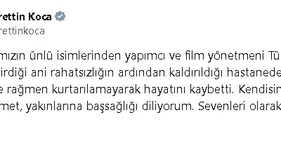 SAĞLIK Bakanı Fahrettin Koca, yapımcı ve film yönetmeni Türker İnanoğlunun rahatsızlığın nedeniyle kaldırıldığı hastanede hayatını kaybettiğini duyurdu.Sağlık Bakanı Koca, sosyal medya hesabından yaptığı açıklamada, “Sanat dünyamızın...