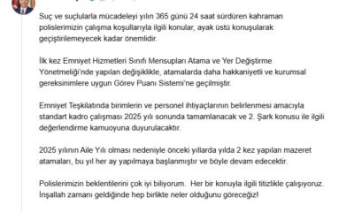 İçişleri Bakanı Ali Yerlikaya, polis atama ve yer değiştirme işlemleri ile ilgili NSosyal hesabından açıklama yaptı. Bakan Yerlikaya, “Suç ve suçlularla mücadeleyi yılın 365 günü 24...