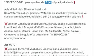 İÇİŞLERİ Bakanı Ali Yerlikaya, Giresun, Niğde, Osmaniye ve Zonguldak merkezli 14 ilde düzenlenen Sibergöz-28 operasyonlarında 34 şüphelinin yakalandığını duyurdu.Bakan Yerlikaya, sosyal medya hesabından yaptığı açıklamada, Emniyet...