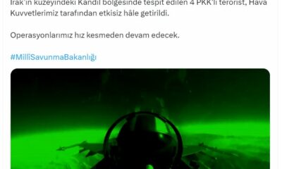 MSB: Irak’ın kuzeyindeki Kandil bölgesinde tespit edilen 4 PKKlı terörist, Hava Kuvvetlerimiz tarafından etkisiz hâle getirildi.