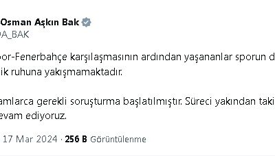 Gençlik ve Spor Bakanı Osman Aşkın Bak, Trabzonspor-Fenerbahçe maçı ardından yaşanan olaylara ilişkin açıklama yaptı.Gençlik ve Spor Bakanı Bak, sosyal medya hesabından yaptığı paylaşımda, “Trabzonspor-Fenerbahçe karşılaşmasının...