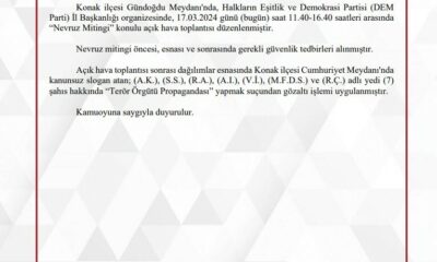 İZMİRin Konak ilçesinde, DEM Partinin düzenlediği nevruz etkinliğinde terör örgütü lehinde slogan attığı iddiasıyla 7 şüpheli gözaltına alındı.Halkların Eşitlik ve Demokrasi Partisi (DEM) İl Başkanlığı tarafından...