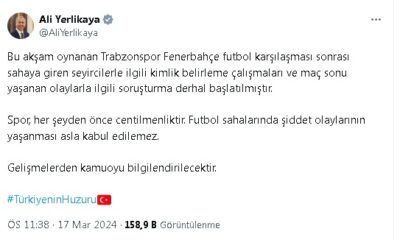 İÇİŞLERİ Bakanı Ali Yerlikaya, Trabzonspor-Fenerbahçe maçı sonrası gerçekleşen olaylar ile ilgili inceleme başlatıldığını ve sahaya inen seyircilerin kimlik belirleme süreçlerinin başlatıldığını bildirdi.Bakan Yerlikaya, Trabzonspor-Fenerbahçe maçı sonrası...