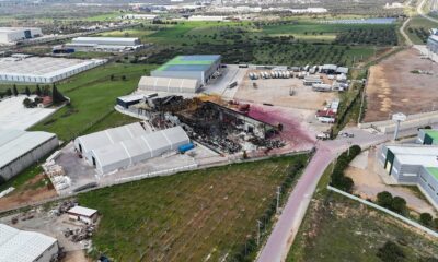 İZMİRde, dün yangın çıkan ve 13 saatte kontrol altına alınan soğuk hava deposunun son hali, havadan görüntülendi.Kemalpaşa ilçesi Kuyucak Mahallesi Ankara asfaltındaki lojistik firmasına ait soğuk...