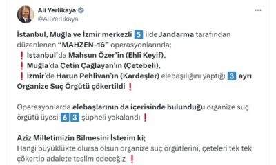 İÇİŞLERİ Bakanı Ali Yerlikaya, İstanbul, Muğla ve İzmir merkezli 5 ilde düzenlenen Mahzen-16 operasyonlarında 3 ayrı organize suç örgütünün çökertildiğini ve 63 şüphelinin yakalandığını duyurdu.Bakan Yerlikaya,...