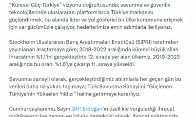 CUMHURBAŞKANLIĞI Savunma Sanayii Başkanı Haluk Görgün, 2018-2022 aralığında küresel büyük silah ihracatının yüzde 1,1ini gerçekleştirip, 12nci sırada yer alan Türkiyenin 2019-2023 aralığında bu oranı yüzde 1,6ya...