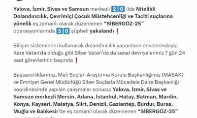 İÇİŞLERİ Bakanı Ali Yerlikaya, Yalova, İzmir, Sivas ve Samsun merkezli 20 ilde nitelikli dolandırıcılık, çevrimiçi çocuk müstehcenliği ve tacizi suçlarına yönelik eş zamanlı düzenlenen Sibergöz-25 operasyonlarında...