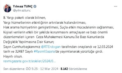 ADALET Bakanı Yılmaz Tunç, hak arama, suç ile mücadele, kişisel hakların korunması ve daha birçok kanunun değişmesini kapsayan 8inci yargı paketinin Resmi Gazetede yayımlanarak yürürlüğe girdiğini...