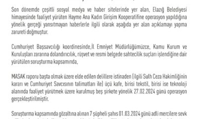 ELAZIĞ Valiliği, polisin kamuyu 4 milyon 200 bin lira zarar uğratan 5 şirkete düzenlediği Cımbız 2 operasyonuyla ilgili sosyal medya ve bazı haber sitelerindeki Elazığ Belediyesine...