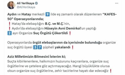 Bakan Yerlikaya: Aydın ve Hatay merkezli 9 ilde eş zamanlı olarak düzenlenen “KAFES-50″ operasyonlarında örgüt elebaşlarının da içerisinde bulunduğu organize suç örgütü üyesi 37 şüpheli yakalandı.
