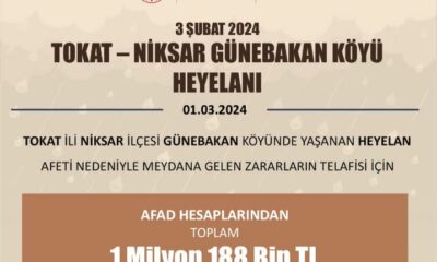 İÇİŞLERİ Bakanı Ali Yerlikaya, heyelan nedeniyle Genel Hayata Etkili Afet Bölgesi ilan edilen Tokatın Niksar ilçesi Günebakan köyü için 1 milyon 188 bin lira acil yardım...