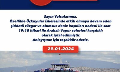 İZMİR’de olumsuz hava koşulları nedeniyle arabalı vapur seferleri saat 19.15 itibariyle iptal edildi. Ege Denizinde etkili olan rüzgar ve olumsuz deniz koşulları nedeniyle İzmir Deniz İşletmeciliği (İzdeniz),...
