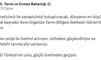 Bakanlığın sosyal medya hesabından yapılan açıklamada, “Üreticimiz ile sanayicimizi buluşturacak, dünyanın en büyük jeotermal kaynaklı Sera Organize Tarım Bölgesi Balıkesir Gönende kuruluyor. Bu dev proje ile...
