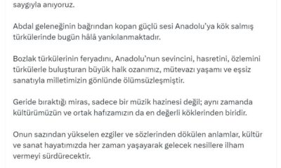 Bakan Ersoy, sosyal medya hesabından yayımladığı mesajda, “Türkülere bir ömür adayan Neşet Ertaşı vefatının 13üncü yıl dönümünde saygıyla anıyoruz. Abdal geleneğinin bağrından kopan güçlü sesi Anadoluya...