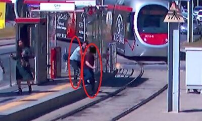 Kayseri’de bir vatandaş tramvayın geldiğini fark etmeyip, tramvay hattından karşıya geçmek istedi. O sırada vatandaşın raylara yöneldiğini gören güvenlik görevlisi, vatandaşı kolundan tutarak geri çekti. O...