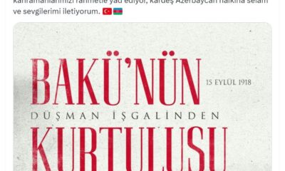 Cumhurbaşkanı Erdoğan, sosyal medya hesabından yayımladığı mesajda, “Can Azerbaycanın başkenti Bakünün düşman işgalinden kurtuluş yıl dönümünü en kalbi duygularımla tebrik ediyorum. Kafkas İslam Ordusu Komutanı Nuri...