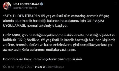 SAĞLIK Bakanı Fahrettin Koca, 15 Eylül’de 65 yaş üstü ve kronik hastalığı olanlar için grip aşısı uygulamasının başlayacağını açıkladı. Bakan Koca, sosyal medya hesabından yaptığı paylaşımda, “15 Eylül’den itibaren 65...