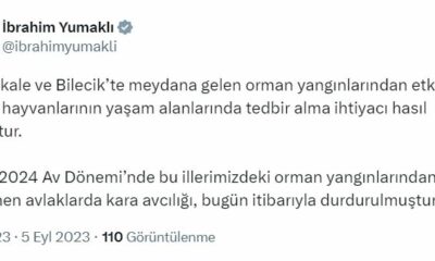 TARIM ve Orman Bakanı İbrahim Yumaklı, Çanakkale ve Bilecik’te orman yangınlarından etkilenen avlaklarda kara avcılığının durdurulduğunu duyurdu. Bakan Yumaklı, sosyal medya hesabından yaptığı açıklamada, “Çanakkale ve...