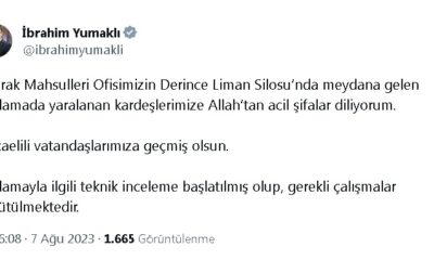 TARIM ve Orman Bakanı İbrahim Yumaklı, Toprak Mahsulleri Ofisi’nin Derince Liman Silosu’nda meydana gelen patlamayla ilgili inceleme başlatıldığını duyurdu. Bakan Yumaklı, Twitter hesabından yaptığı paylaşımda, “Toprak Mahsulleri Ofisimizin...