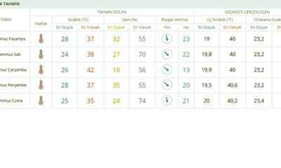 METEOROLOJİ Genel Müdürlüğü, 26 Temmuz’da İzmir kent merkezinde hava sıcaklığının 42 derece kadar yükselmesinin beklendiğini bildirdi. Çöl sıcakları yurdun büyük bir kesiminde etkisini sürdürürken, yeni haftada...