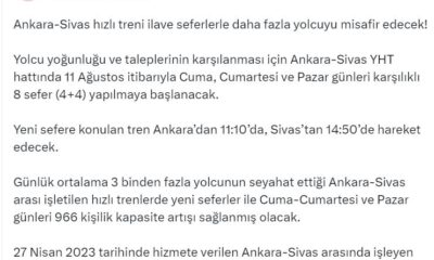 TÜRKİYE Cumhuriyeti Devlet Demiryolları (TCDD) Taşımacılık Anonim Şirketi, 11 Ağustos’tan itibaren Ankara-Sivas hızlı tren hattında cuma, cumartesi ve pazar günleri ek sefer yapılmaya başlanacağını açıkladı. TCDD Taşımacılık...