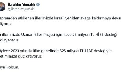 TARIM ve Orman Bakanlığı’nca, ‘Uzman Eller Projesi’ kapsamında Kahramanmaraş merkezli depremlerden etkilenen iller için 75 milyon lira ek bütçe verildi. Bakanlıktan yapılan yazılı açıklamaya göre; deprem...