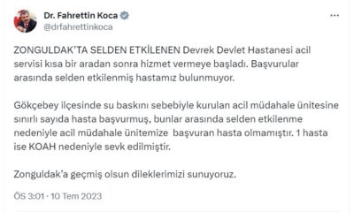 SAĞLIK Bakanı Fahrettin Koca, Bartın’da sel felaketiyle ilgili acil sağlık ihtiyaçlarının karşılandığını belirterek, “Hastanelere ulaşan 4 yaralıdan 2’sinin tedavisi devam ediyor, 2 kişi taburcu edilmiştir” dedi....