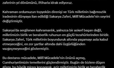 İletişim Başkanlığının sosyal medya hesabından Cumhurbaşkanı Recep Tayyip Erdoğanın 13 Eylül Sakarya Zaferi’nin yıl dönümü mesajı yayımlandı. Erdoğan, mesajında, “Milletimizin istiklal ve istikbal mücadelesinde dönüm noktalarından...