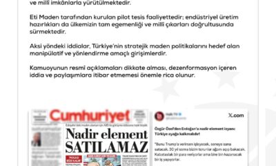 DMMnin sosyal medya hesabından yapılan açıklamada, “Bazı basın yayın organlarında yer alan Eskişehir Beylikova nadir toprak elementleri (NTE) sahasının ABDye devredileceği yönündeki iddialar tamamen asılsızdır. Beylikova...